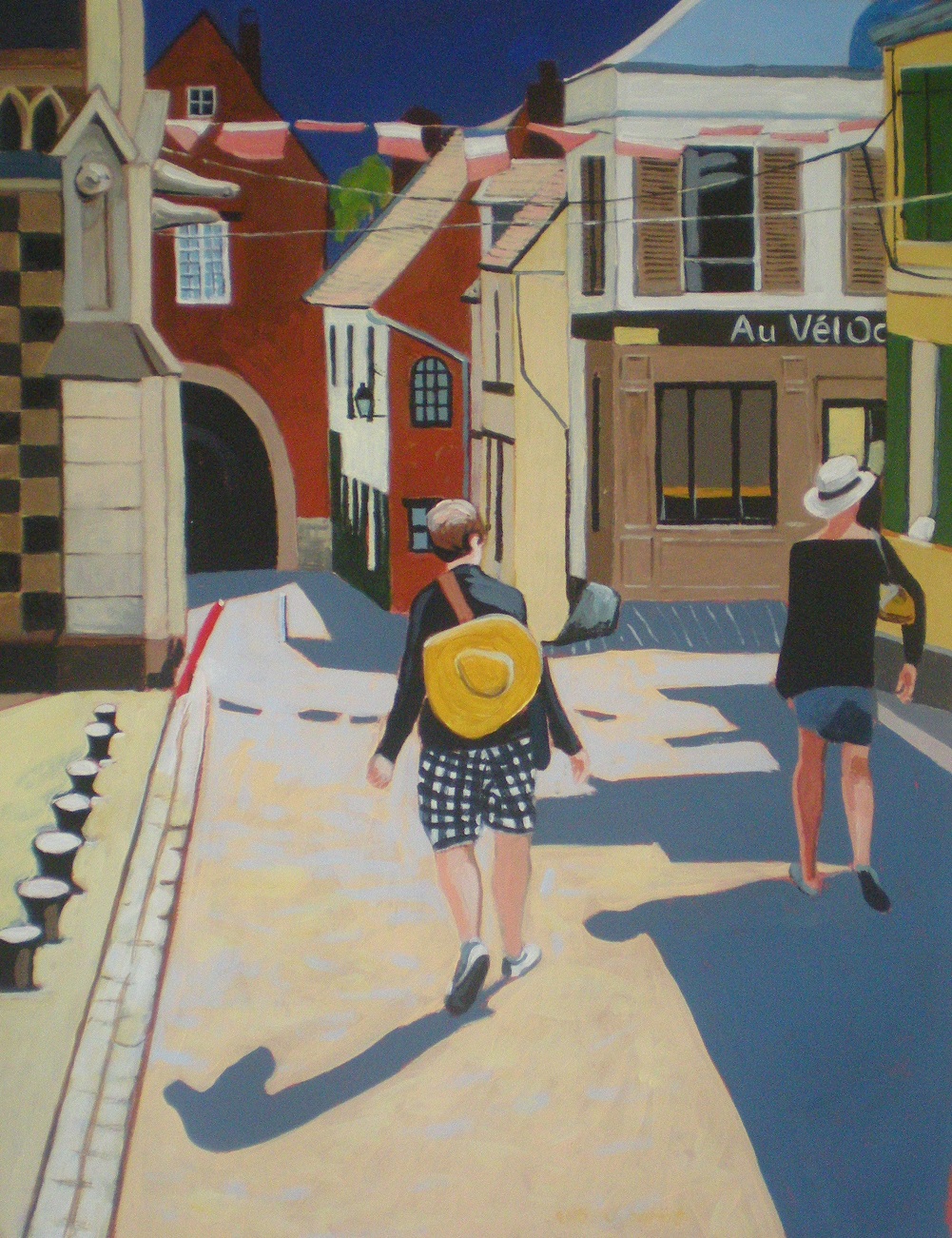 Je travaille sur une série de tableaux illustrant une journée passée à Saint Valery avec ma mère et ma soeur. C’était en juillet, ce qui explique les drapeaux et le ciel bleu. On dirait que ma mère porte le soleil sur son dos.